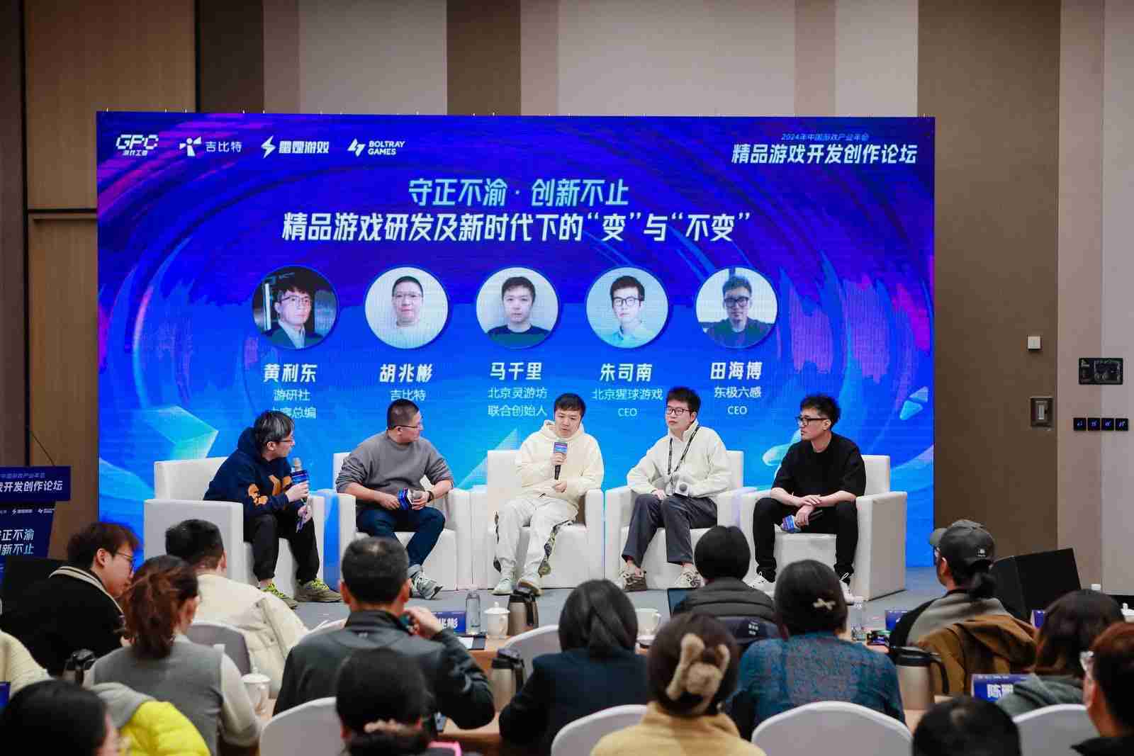 圆桌对话环节,,,,在游研社内容总编黄利东的主持下,,,,35273CTO胡兆彬、、、、北京灵游坊联合创始人马千里、、、北京猩球游戏CEO朱司南、、、、东极六感CEO田海博等四位嘉宾围绕“守正不渝、、创新不止——精品游戏研发及新时代下的‘变’与‘不变’”这一主题分享了各自在精品游戏开发理念及工程能力搭建方面的见解和经历,,,,并就行业变化下游戏人需要坚守的理念等展开交流探讨。。