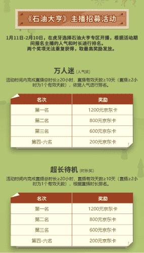 除了“油王”争霸赛,,精英主播招募活动亦同步开启!!!赛事分时长奖和人气奖,,,奖励同样丰厚!!!!